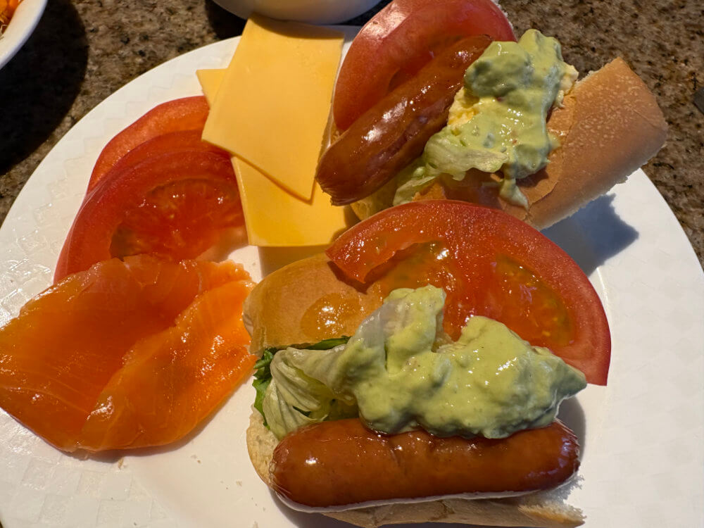 この時はサーモン、キッシュ、サラミを取ってきました。子どもはジュースとチーズ、トマトなどを食べていました。